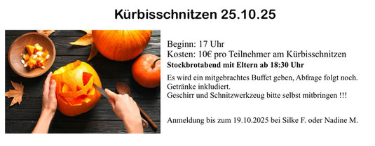 Am 25.10.2025 laden wir herzlich zum gemeinsamen Kürbisschnitzen auf unsere Reitanlage ein. Anschließend lassen wir den Abend bei einem gemeinsamen Essen ausklingen. Meldet euch gerne bei unseren Jugendwartinnen an!